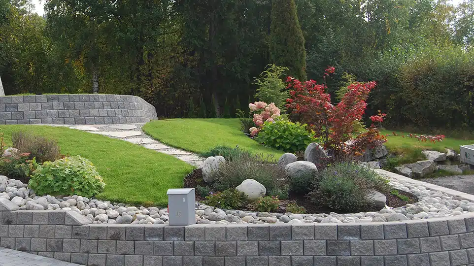 Støttemurer av naturstein og betongprodukter er viktige elementer ved opparbeidelse og renovering av hageanlegg.